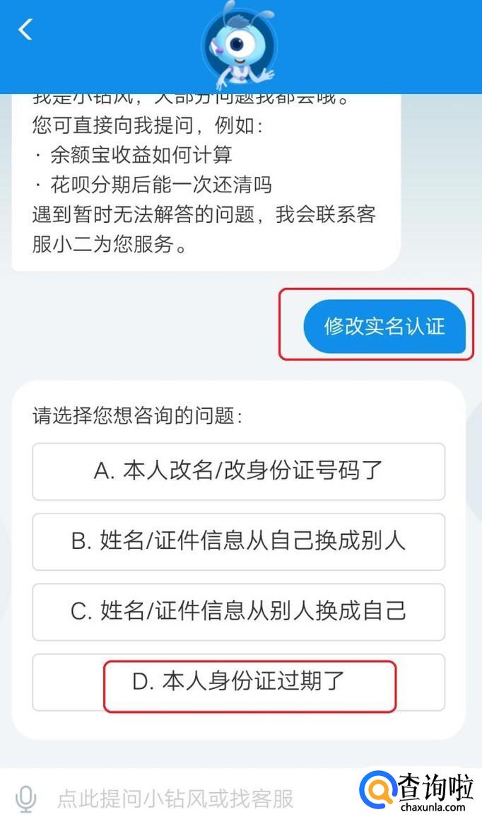 在对话框中输入“修改实名认证”,会智能匹配多个问题,可以根据自己的实际情况选择一个进行修改。如我选择“D”