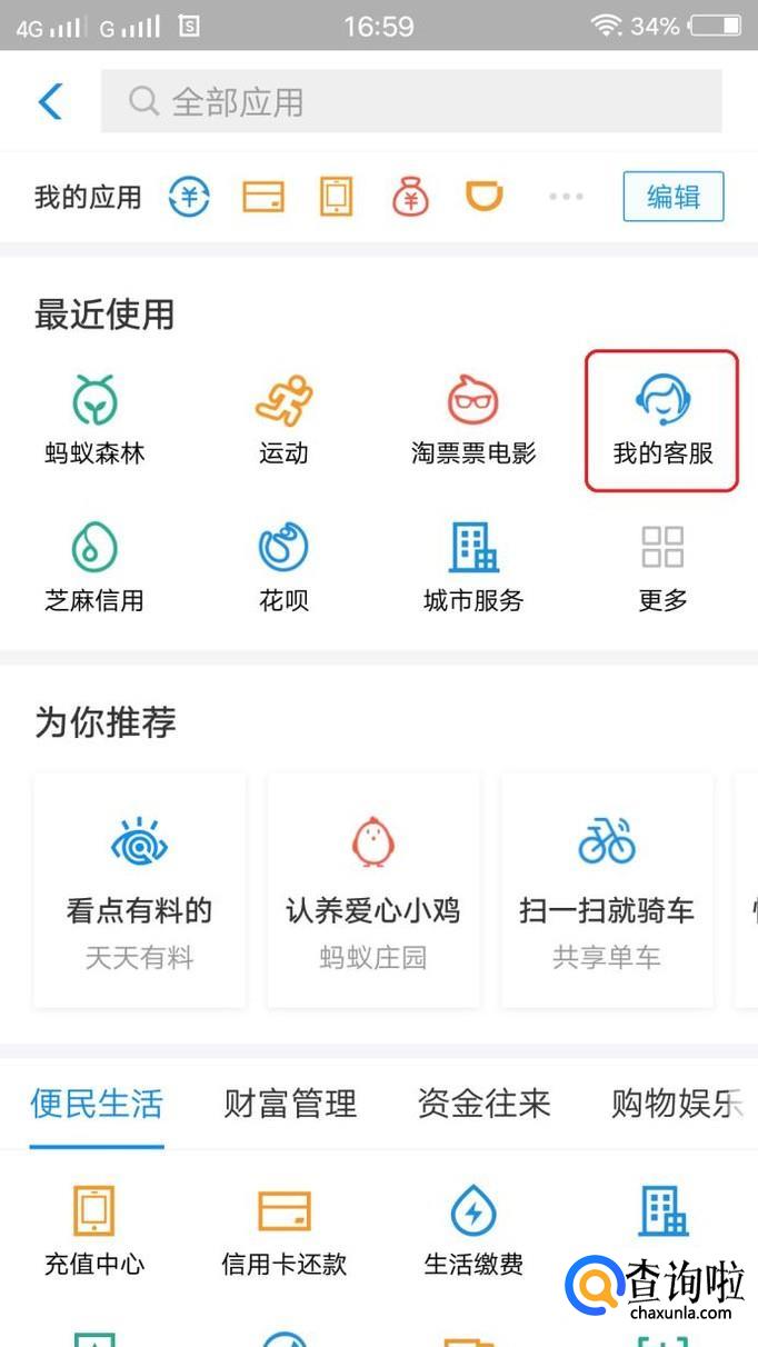 在新页面的“最近使用”中,可以看到“我的客服”选项。