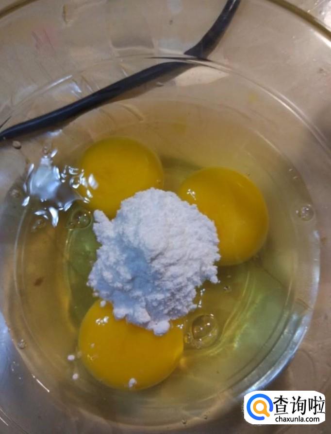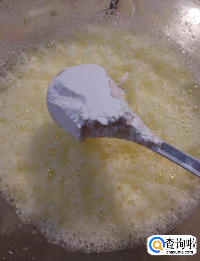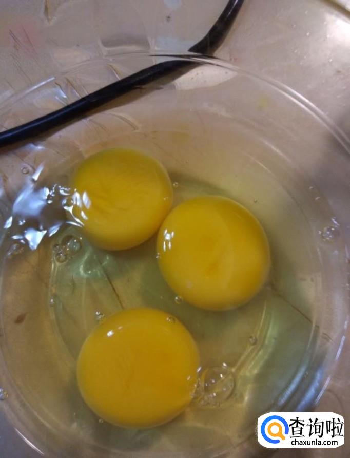 首先我们将三个鸡蛋打入碗中,加入一斤低筋面粉,搅拌均匀