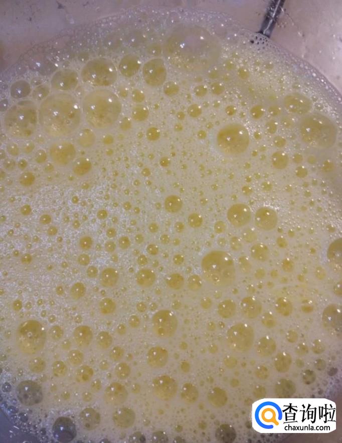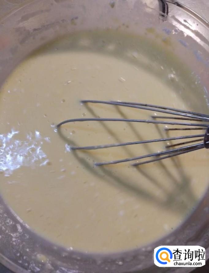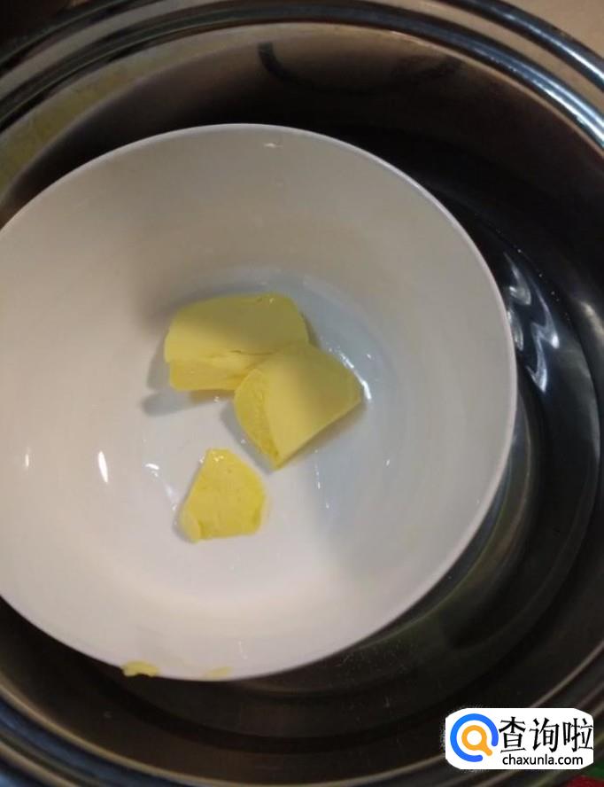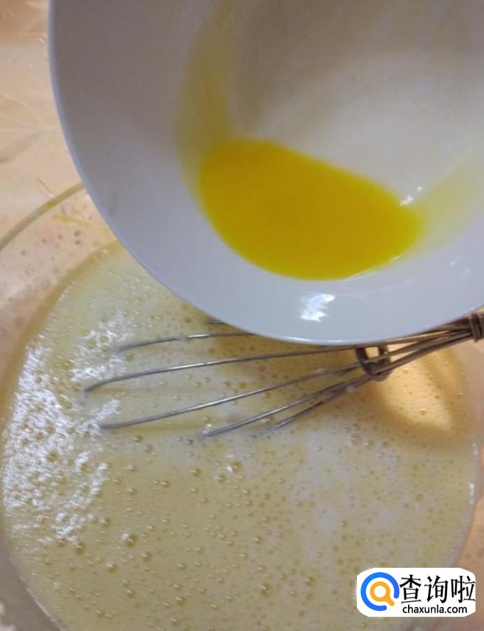 然后我们将黄油放入一个碗中,在热水锅中隔水加热至溶化,倒入蛋奶糊中,搅拌均匀