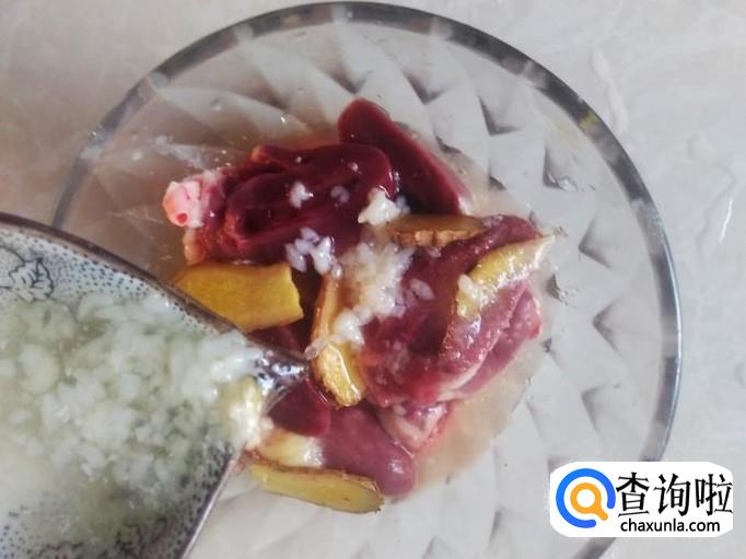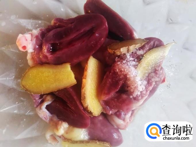 把鸭心清洗干净,然后把每个鸭心切成两边,加适量的盐、姜片、糯米酿腌制几分钟。