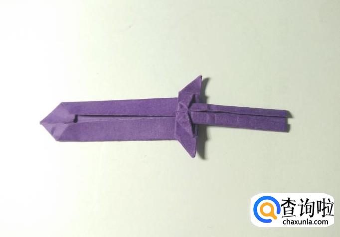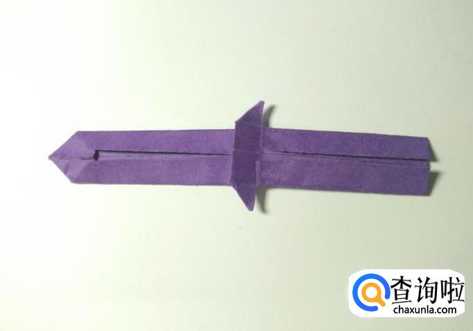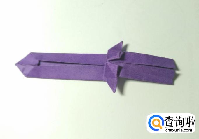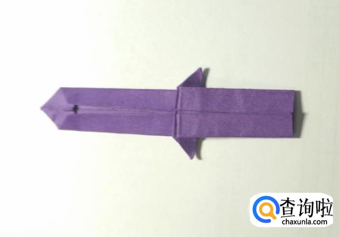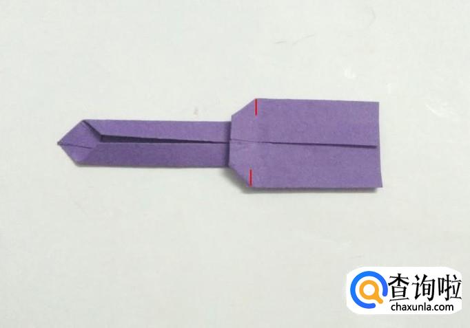 翻过折纸,将红线处用剪刀剪开,然后把剪开处的右侧上下两面分别折向中心线。