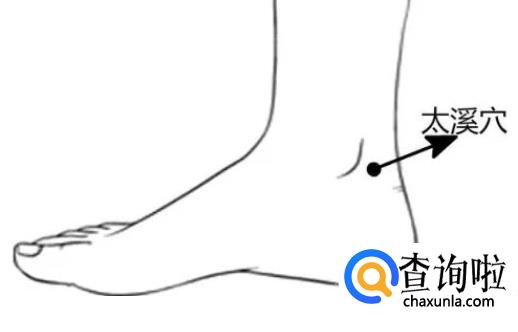 太溪穴,是足少阴原穴。其位于足内侧,内踝后方与脚跟骨筋腱之间的凹陷处,也就是说在脚的内踝与跟腱之间的凹陷处。主治腰脊痛,下肢厥冷,内踝肿痛,咽喉肿痛,齿痛,耳聋,耳鸣,气喘,胸痛咯血,消渴,月经不调,失眠,健忘,遗精,使用拇指与食指捏住反复揉捏50次左右即可。