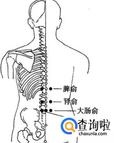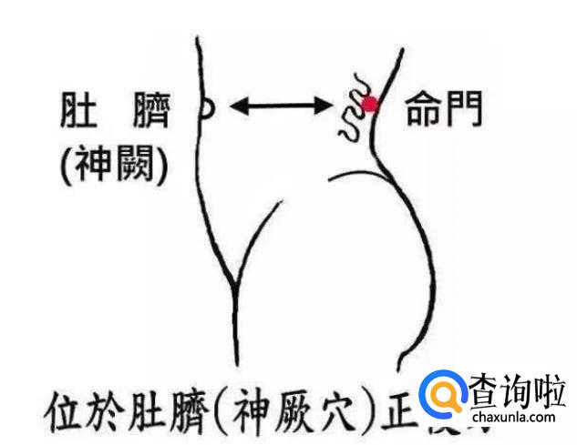 命门穴:位于第二、三腰椎棘突间。在腰背筋膜、棘上韧带及棘间韧带中,有腰动脉后支及棘间皮下静脉丛,布有腰神经后支内侧支。主治虚损腰痛,遗尿,泄泻,遗精,阳痿,早泄,赤白带下,月经不调,胎屡坠,汗不出等;可以右手或左手握拳,以拳尖置于命门穴上,先顺时针压揉10次,再逆时针压揉10次,重复压揉40次。