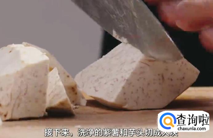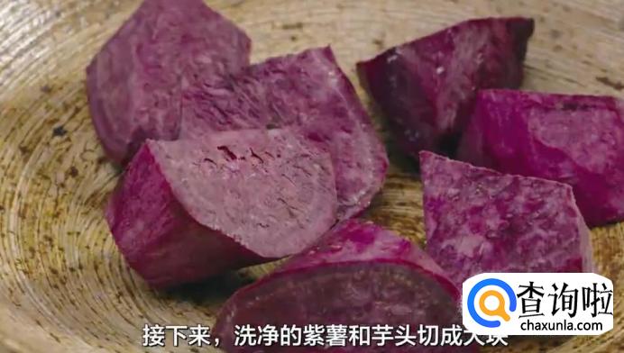 接下来,将洗净的紫薯和芋头切成大块。