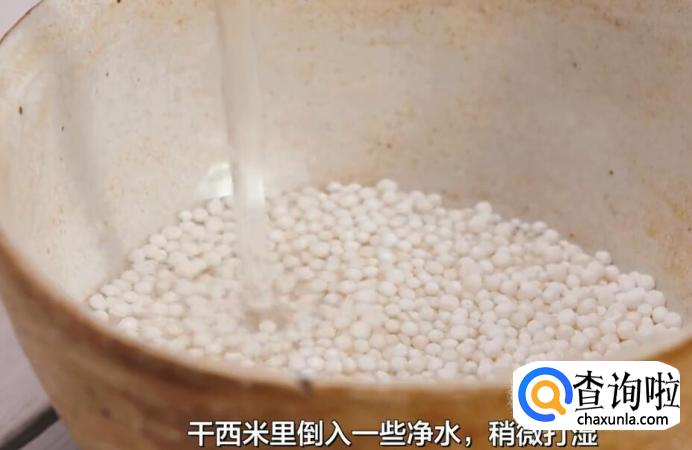 将干西米倒入一些净水,稍微打湿。