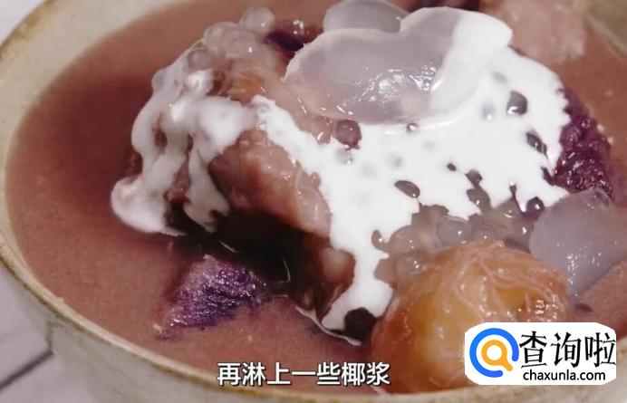 加一勺西米露、2颗亚达子,再淋上一些椰浆。