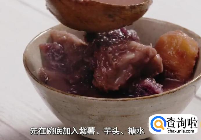 最后开始制作成品。先在碗里加入紫薯、芋头和糖水。