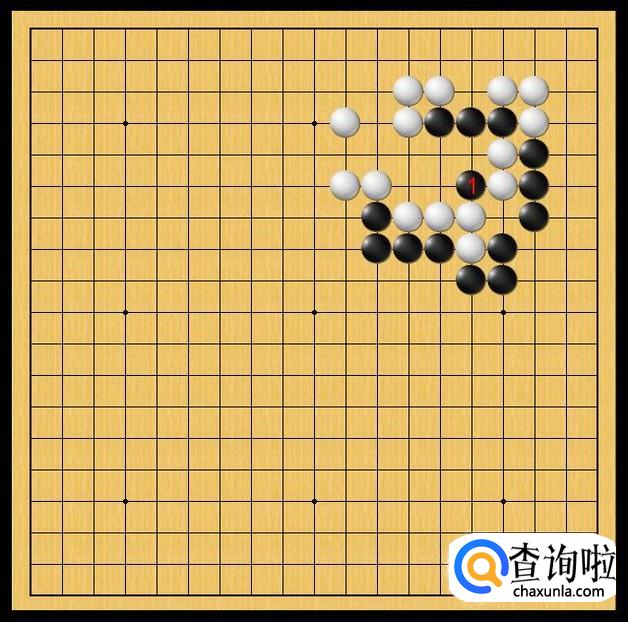 黑方先行,黑方考虑到中腹黑三子势力单薄,于是,黑棋抢先在黑1处落子,企图和外围黑棋配合断掉白二子。如图所示。