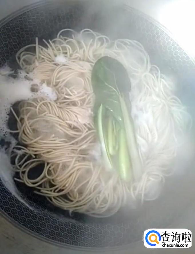 首先我们将面条放入热水锅中,再放点油菜,煮熟捞出备用