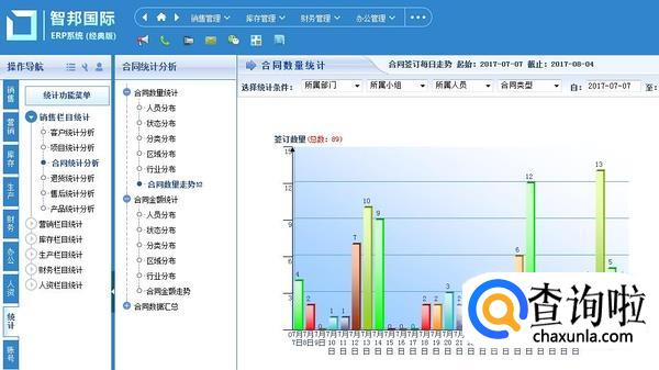 对企业管理来说,统计功能至关重要要,通过统计报表,每个部门,每项业务、每位员工的工作成果都能一目了然的呈现。同时,智邦国际ERP系统支持柱状图、折线图、饼状图等多种统计方式,方便管理者更加直观的统筹和查阅各部门统计数据,及时发现问题,为企业决策提供精准可靠的数据依据,进而帮助企业更好更快的发展。