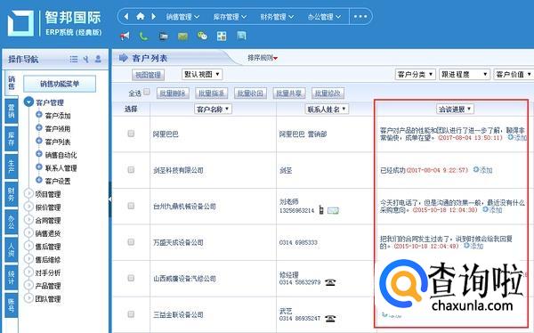 销售是每个企业的管理核心,智邦国际ERP系统更是如此,将客户资源分门别类细分得很好。系统内所有的客户信息能够一目了然,支持快速检索、模糊检索、高级检索;跟进客户后及时填写洽谈进展,领导还能进行点评,及时进行指导、激励等;通过跟进提醒,销售人员能够方便及时的跟进客户;销售业绩和利润实时统计功能,方便了管理者和员工对下一步工作进行实时规划和调整。