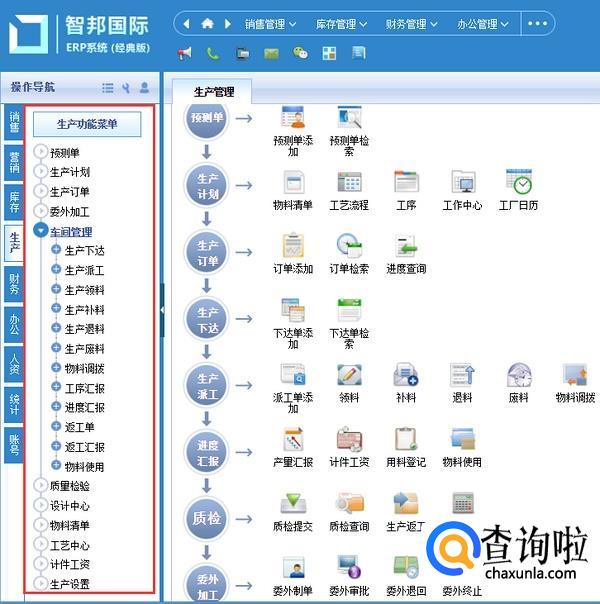 如果仓库没货时,可以由合同生成采购或生产计划;生产部门接到生产任务,可以直接在系统中进行生产下达,可以企业自行生产,也可生成委外加工。随后就是根据进度完成生产、领料、汇报、质检等流程,生产完毕提交入库申请,入库后,仓库就可以根据合同要求安排发货。所有这些,在智邦国际ERP系统内都可以轻松实现。 - 07