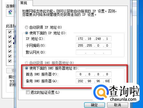 在Internet协议版本4(TCP/IPv4)的属性设置窗口中,点击“使用下面的DNS服务器地址”,并且在下面的DNS服务器地址栏中输入相应的DNS服务器地址,点击“确定”