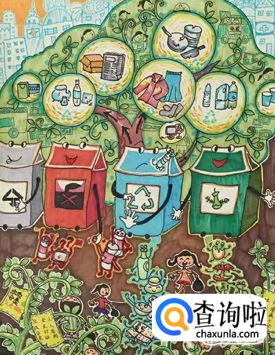 我们的绿水青山是靠垃圾分类助力才有的结果,几个垃圾桶像有了灵魂一样,将分门别类的垃圾纳入,成为了一颗绿树。