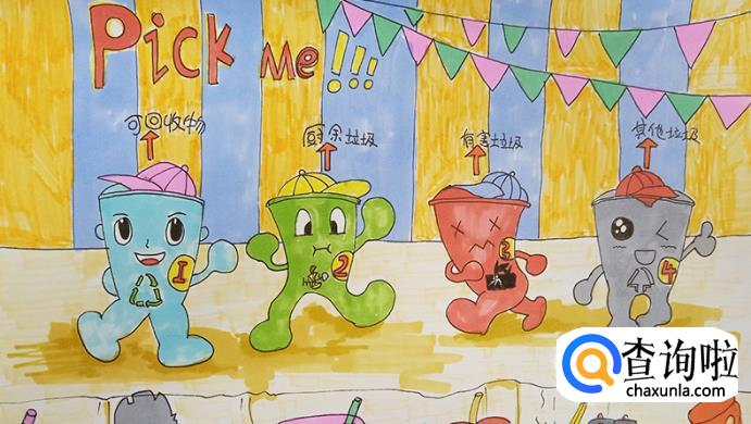 首先画出一个垃圾桶的形状再画两只脚,接着画它的帽子的五官,然后画它的手和序号标识,之后在旁边画帽子和垃圾桶,画出它的四肢和五官,在后面画出舞台,然后在画出下面的观众,在上面画出旗子,在舞台写英文母pickme,那么垃圾分类儿童画就完成了。