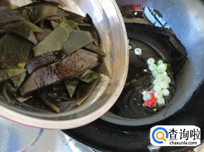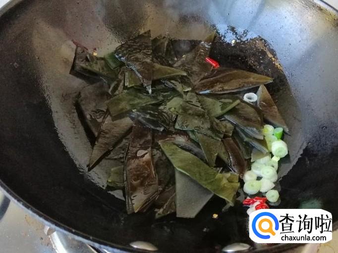 下面准备炒菜,炒锅放油,油热后想放入葱花蒜和干辣椒,习惯吃姜的也可以备些姜丝一起炝锅,把调味品都炒出香味后倒入备好的熟海带,翻炒均匀。