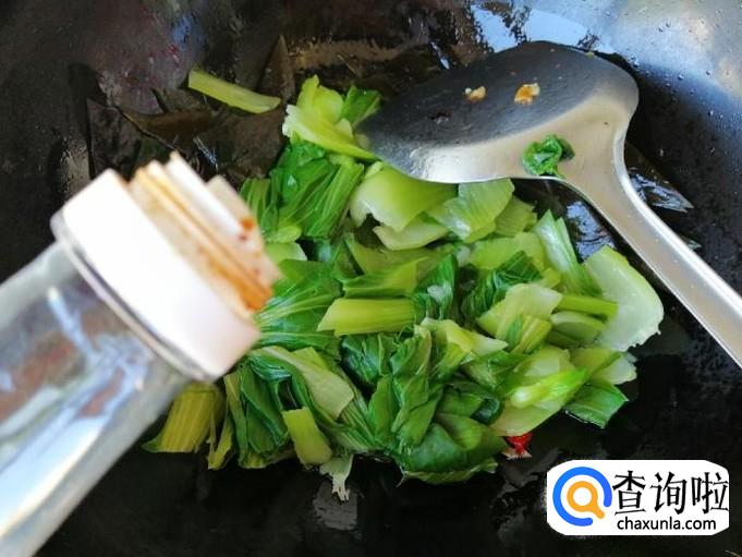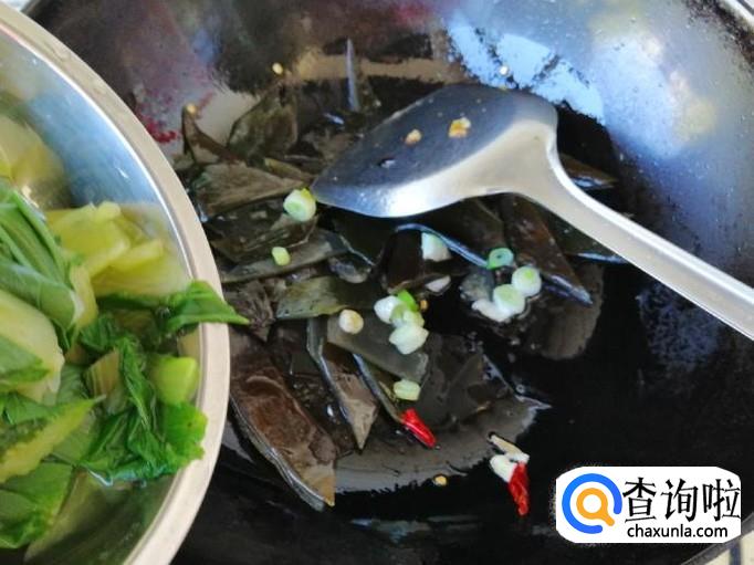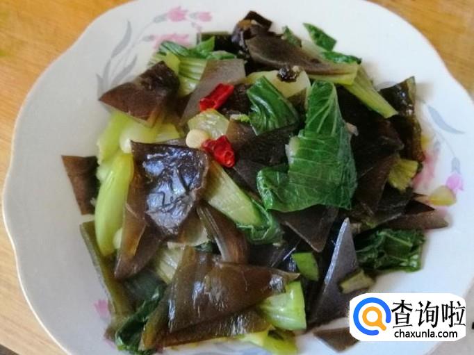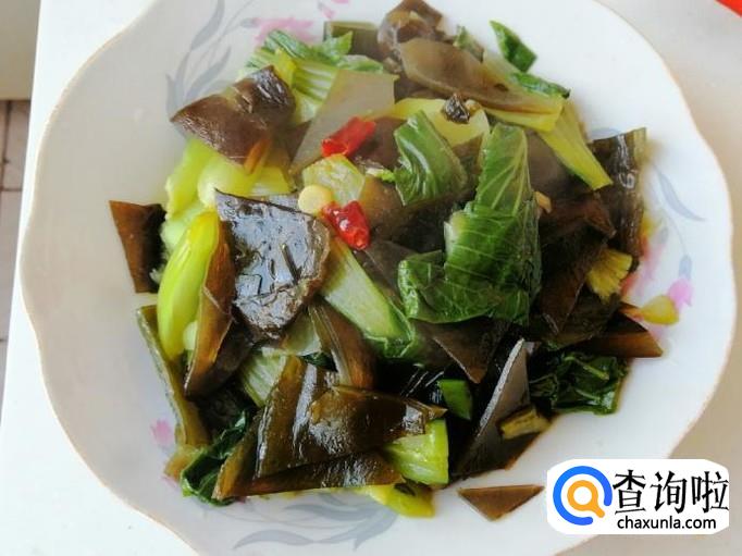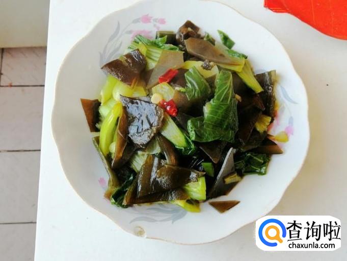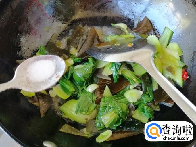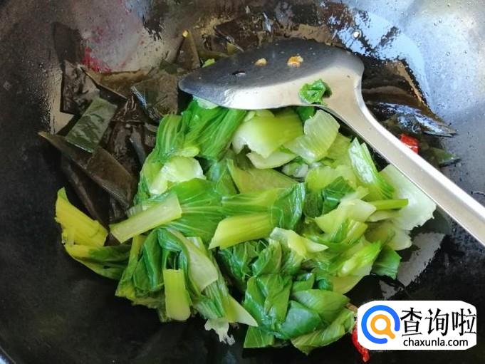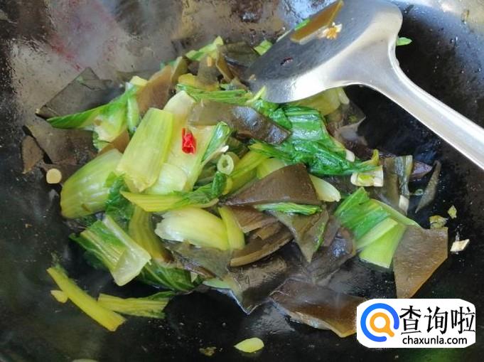 放入生抽翻炒均匀后,放入适量食盐,关火翻炒均匀就可以了,这样如图所示我们的素炒海带油菜就做好了。
