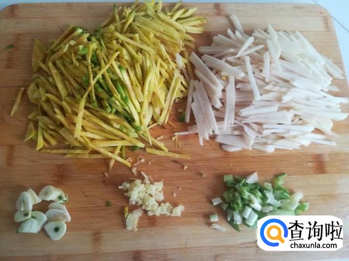 胡萝卜、土豆去皮洗净切成丝,葱切葱花,姜切末,蒜切片。