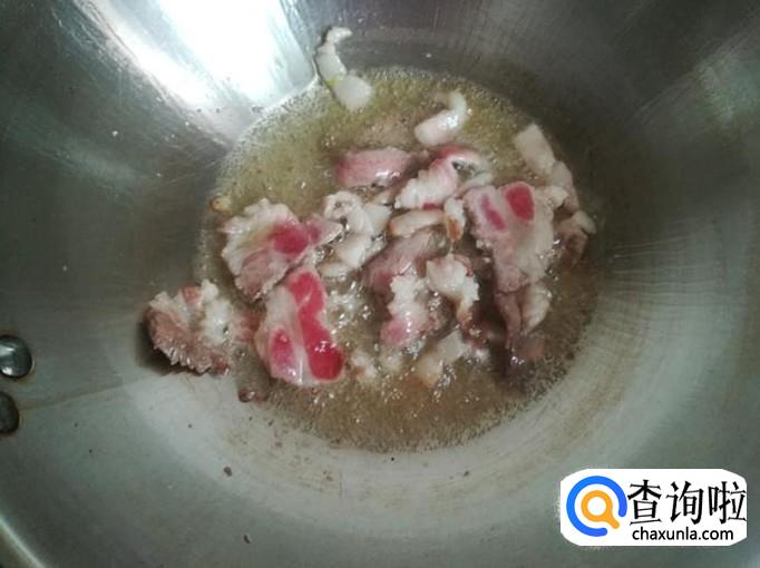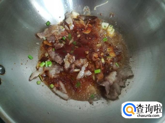 炒锅放入花生油,等油六成熟时,把肉片下锅炒至变色。