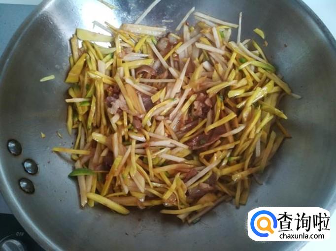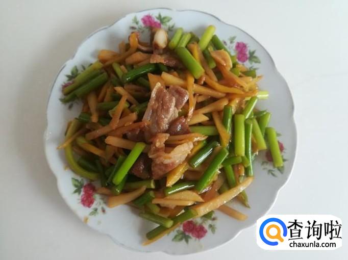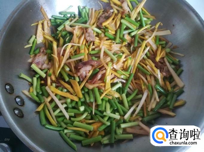 然后用锅铲铲出盛入盘子里,这样肉炒蒜薹黄萝卜土豆丝就做好了。