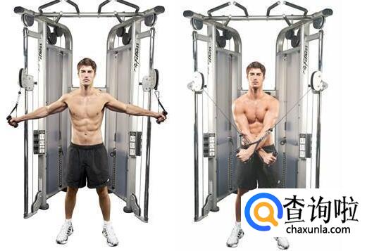 1、立于拉力器架中央,调节好拉索长度,手执马蹄凳做夹胸动作。2、身体略前倾,打开时注意控制动作,合拢时尽力挤压胸肌,略做停顿进行顶峰收缩锻炼次数:每组8~15次,3~5组。注意:1、虽然一般要求双手相触即分开,但如果练胸沟建议采用双手交叉动作,比双手相触的幅度大得多,对胸缝的挤压效果更好,刺激更大。2、这个动作因拉索长度关系,显得很“活”,不太容易控制,所以不要做过低次数的大重量拉伸,以免肩部受伤。一般也是做3~5组,每组8~15次。