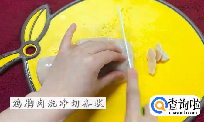鸡胸肉洗干净后切成条。