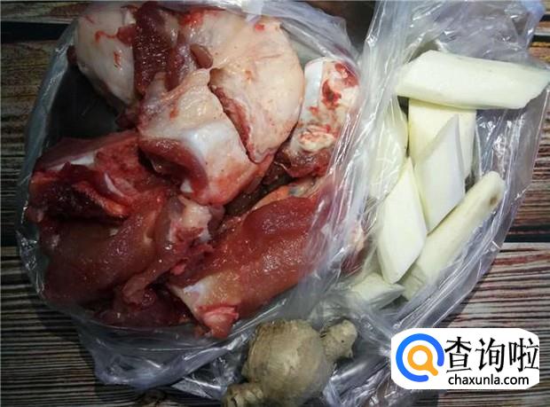 准备好所有材料:筒骨一根、淮山一根、姜适量、蒜头两瓣。