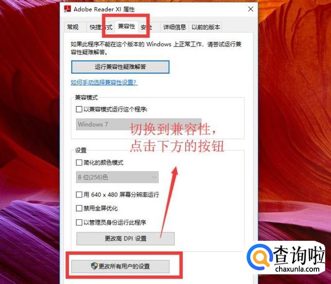 接下来在弹出的软件属性界面中切换到兼容性选项卡页面,然后点击底部的更改所有用户的设置按钮,如下图所示