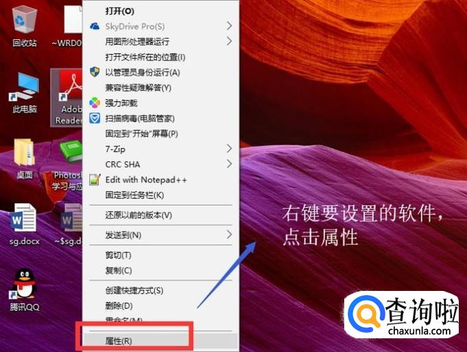 首先找到要设置的软件,然后右键单击选择属性,如下图所示