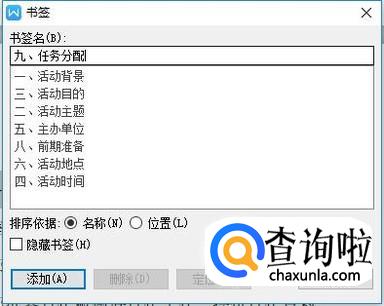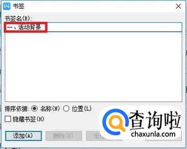 在弹出的书签选项卡中输入书签的名称(即输入选中的内容即可),然后点击“添加”按钮