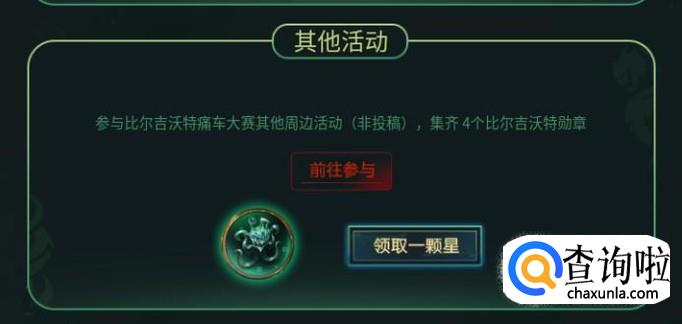 在比尔吉沃特宝藏活动期间参与同人痛车创作大赛活动,收集四颗比尔吉沃特徽章即可领取一颗星。