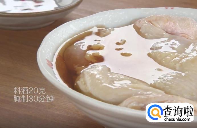 然后,将生姜和葱白段铺在碗底,放上鸡肉,再淋上料酒,放在一旁腌制30分钟。