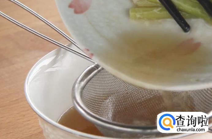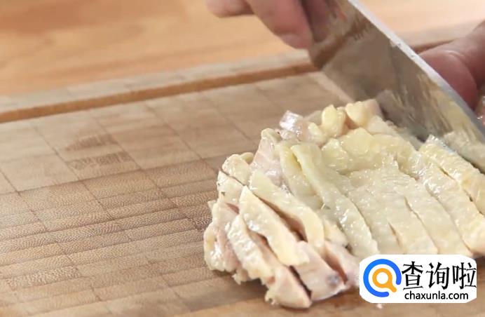 蒸锅开火烧水,烧开之后放入鸡腿,保持大火蒸15分钟。蒸好之后将鸡肉取出,放入冰水里放凉,放凉后切成小块。将碗里的鸡汤滤出,放在一旁备用。