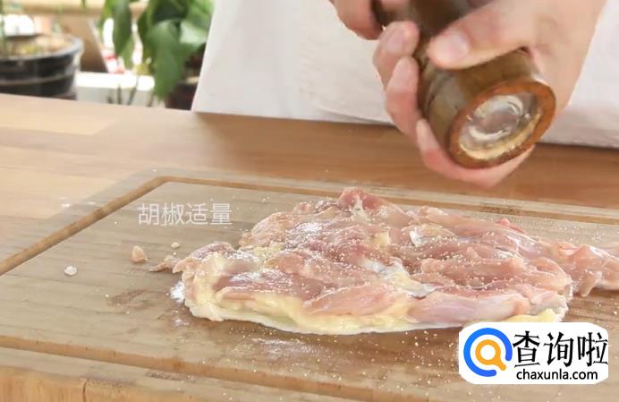接着,将鸡腿的骨头剔除,再撒上适量的盐,抹匀之后再加适量的胡椒,一起腌制一下。