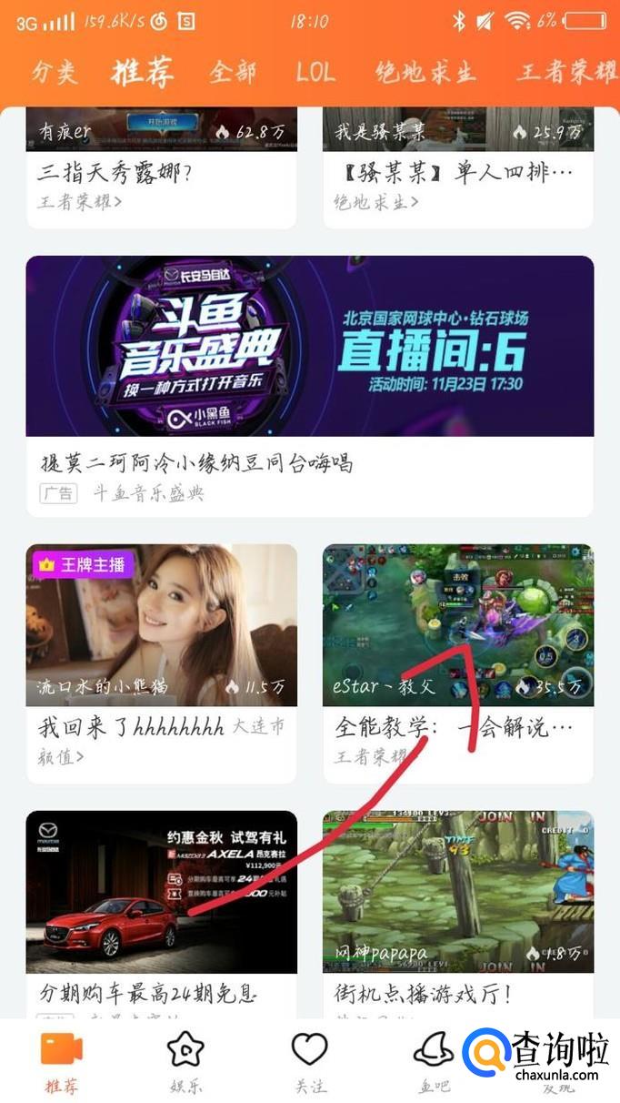 你可以在搜索框中输入你想看的主播或者看推荐里的直播,点击一个,如图1箭头所示。