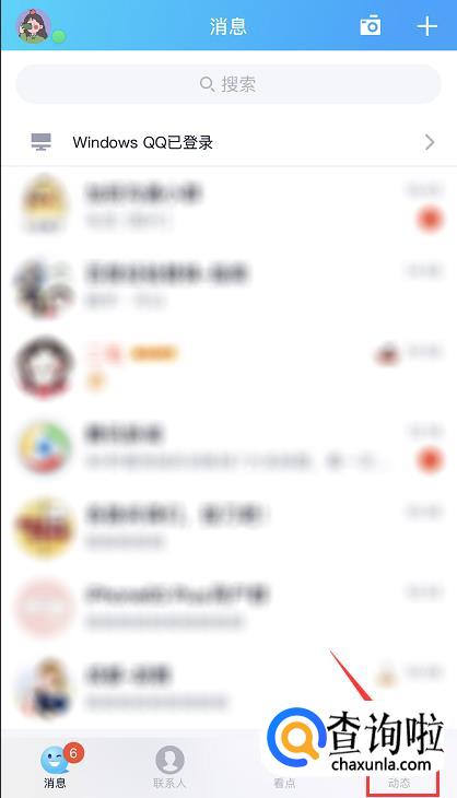 打开手机QQ,进入消息列表页面,在下方的导航栏中点击右下角的【动态】。