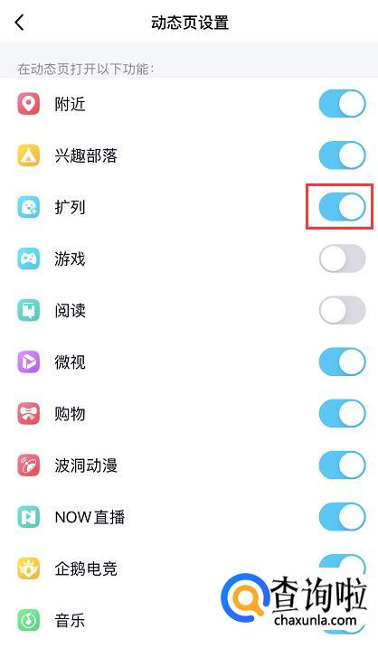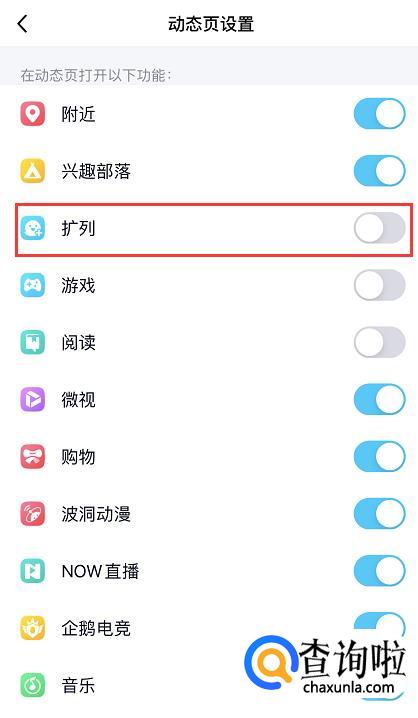 在动态页设置页面,找到“扩列”,将后面的按钮关闭即可。
