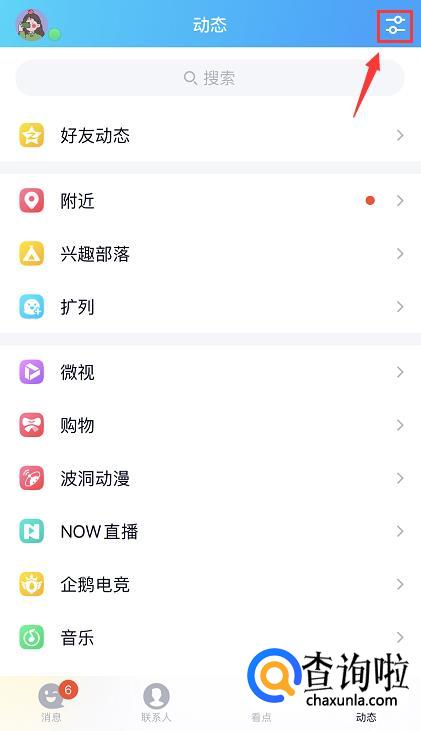 如果我们不想用扩列的功能的话,在列表页点击右上角的图标进入动态页设置。