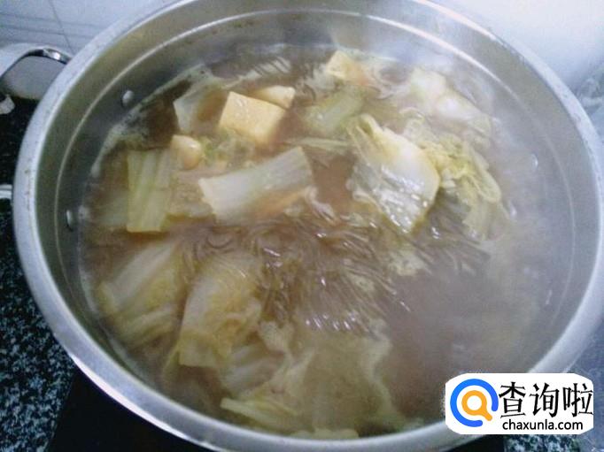 最后葱姜蒜爆香,把白菜放入锅里面翻炒然后加入半锅水,等开锅后加入泡好的粉条、切好的豆腐、适量的盐就可以出锅了。