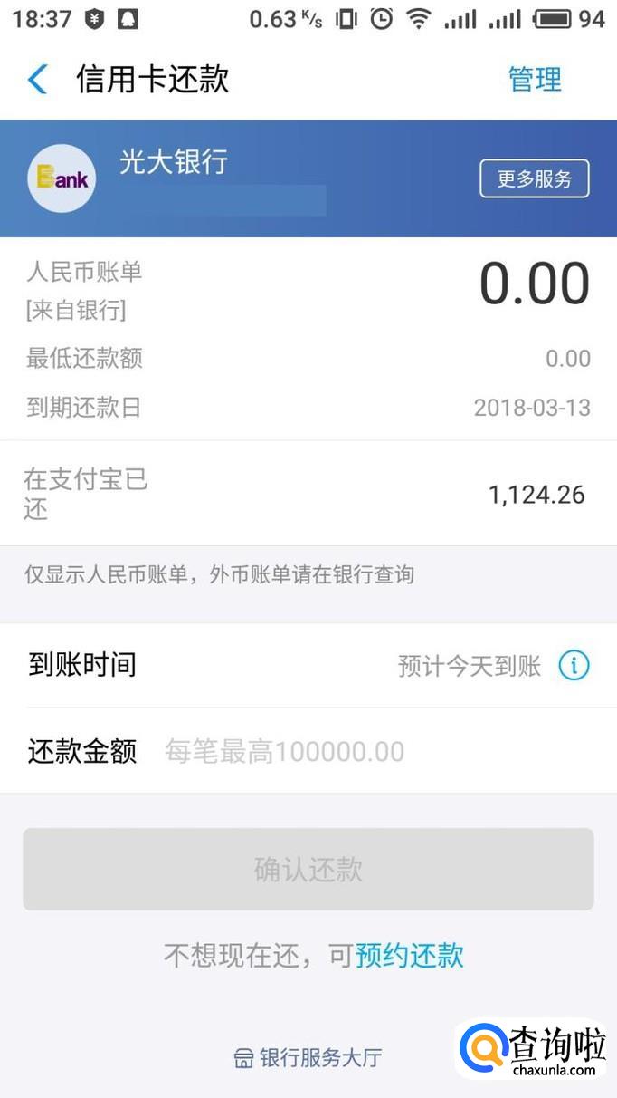 进入还款界面,我们可以看到到账时间“预计今天到账”,也就是说正常还款的话在0点以前都能够到。