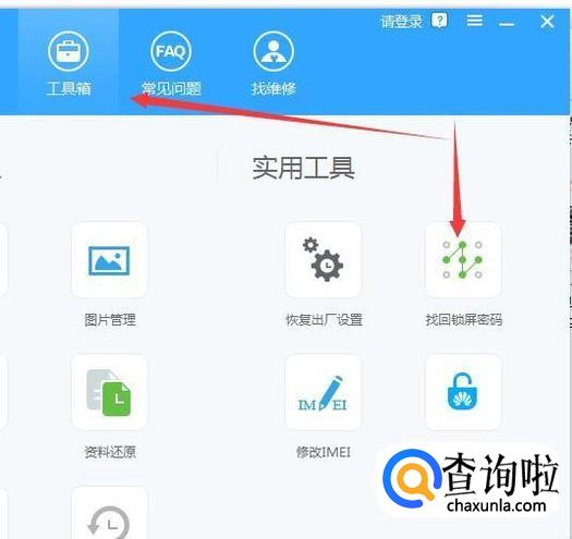 手机连接电脑成功后,我们点击顶部的“工具箱”进入,我们会看到有“找回锁屏密码”的功能。
