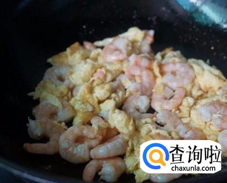 然后,再将盘中焯过水的鲜虾倒入锅中,加入食用盐、适量的凉水,不停上下翻炒。