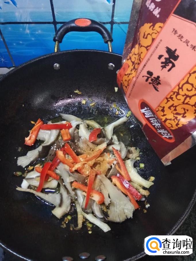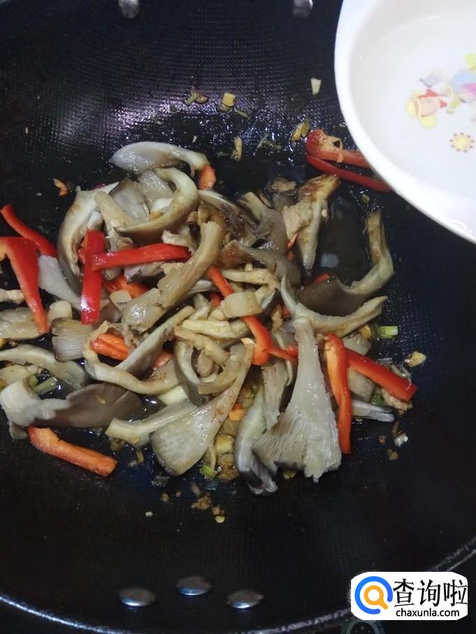 将平菇和红椒放入锅中,翻炒均匀。