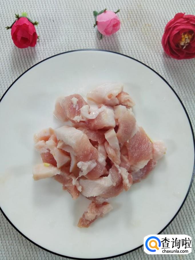 准备适量五花肉,洗净后,切成条,放入盘子中备用。