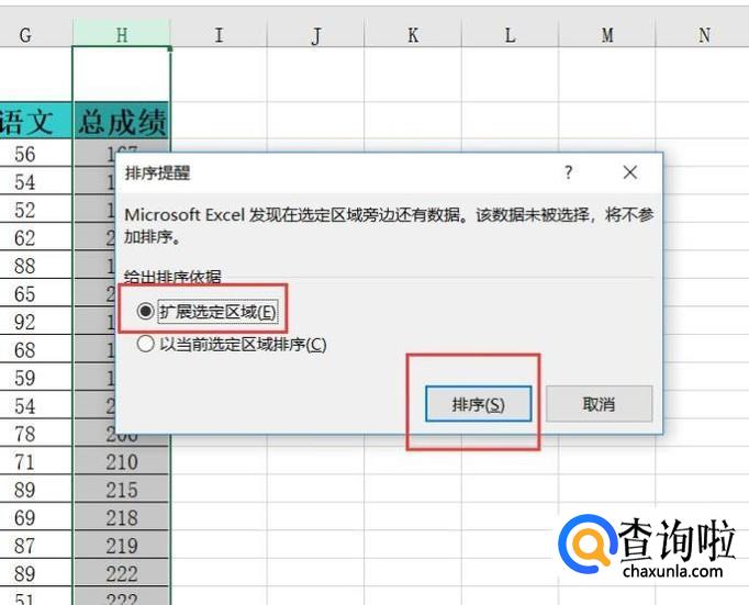 接下来,我们点击“扩展选定区域”按钮,点击“排序”选项。