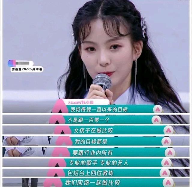 《创造营2020》首次公布顺位成绩前,选手陈卓璇就大方坦露自己对C位的野心,“我一直以来的目标,不是跟一百零一个女孩子在做比较,我的目标都是要跟行业内所有专业的歌手、专业的艺人,包括台上的四位教练,我们应该一起做比较,你们才是我的标准。最高的中心位,第一名。”