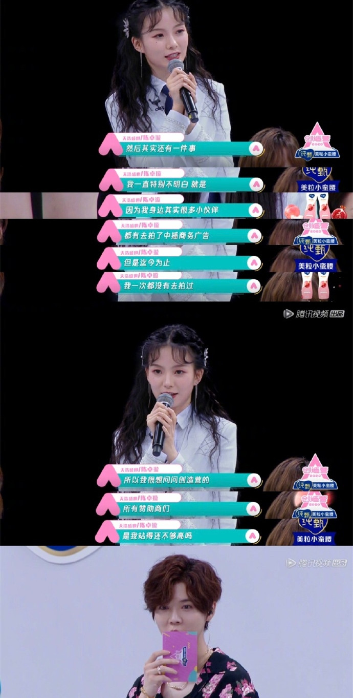 更令人意外的是,陈卓璇在发表感言后,突然喊话节目赞助商,“其实还有一件事,我一直特别不明白,就是,因为我身边其实很多小伙伴都有去拍了中插商务广告,但是迄今为止,我一次都没有去拍过,所以我很想问问创造营的所有赞助商们,是我站得还不够高吗?如果是,我会像刚才我说的那样,竭尽全力往更高的地方,和我的创始人们一起往上爬。”她的一番言论令选手和四位教练都颇为震惊,不少选手纷纷赞叹“太猛了,她这话说的”、“太敢说了”。