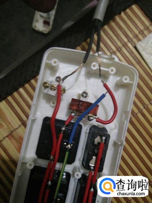 在接着就是接地线,在插排中黄色或绿色的就是地线,电线中地线与它连接就可以了。