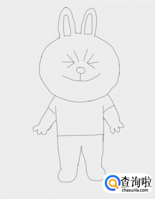 最后在两只胳膊的基础上画出可妮兔的上部身体,再在身体下面画出可妮兔的两条腿及脚部,这样可妮兔我们就画好了,如图所示: